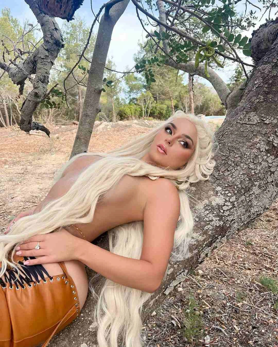 Кралечка, вбрана лише в штанці зі шнурівкою, які майже не приховували її пишних сідниць, попозувала на дереві.