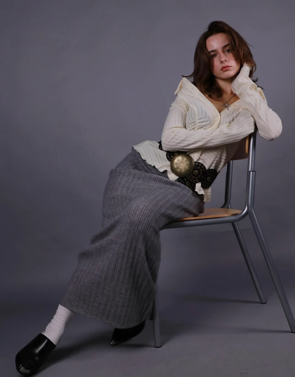 Для фотообразу дівчина обрала сіру трикотажну спідницю максі та кофтинку молочного кольору, яку кокетливо приспустила, оголивши плечі і декольте. Виразну талію Лоліта підкреслила акцентним трендовим ременем.
