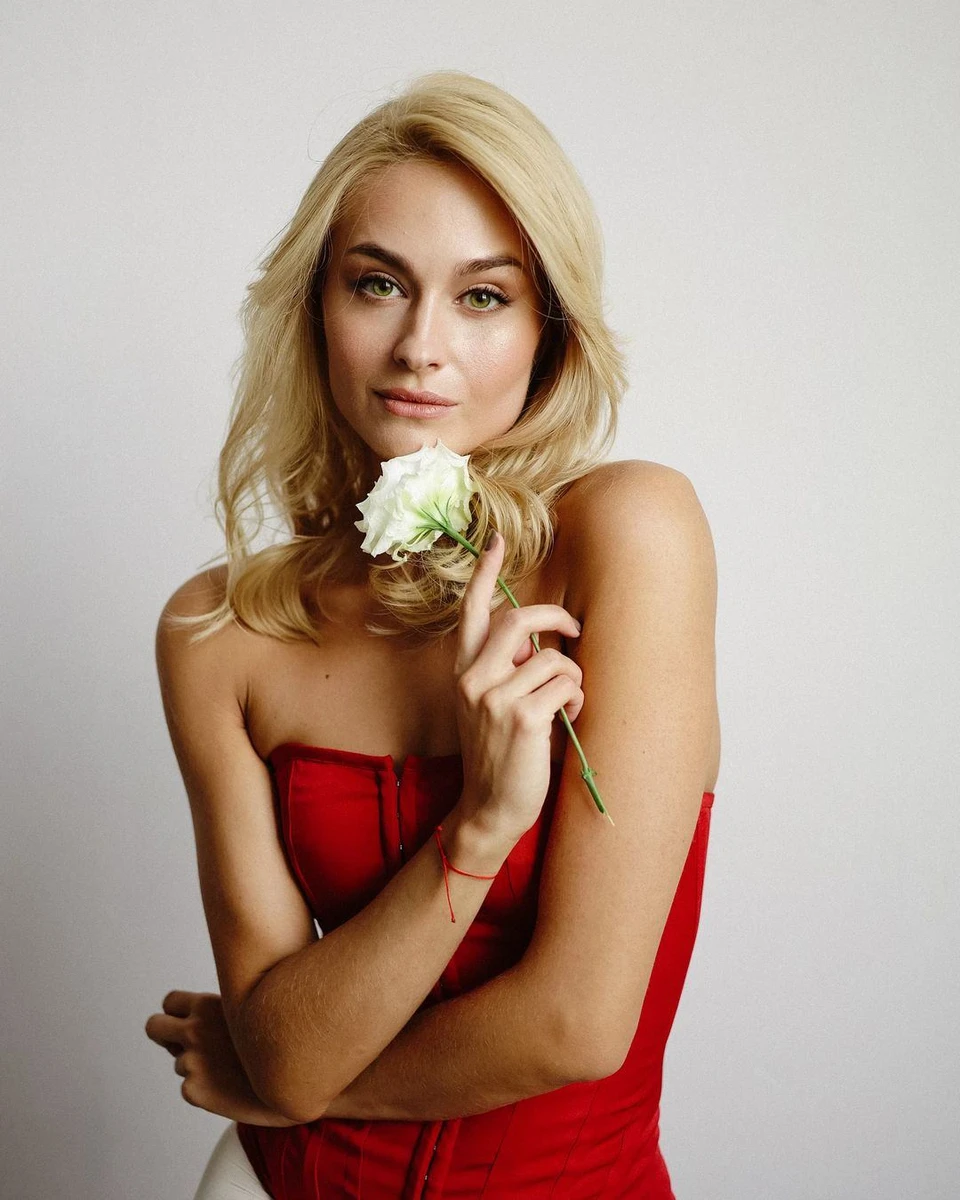 Актриса Анастасія Цимбалару, вбрана у червоний корсет та білі колготки, млосно попозувала біля стіни для лаконічного фотосету.