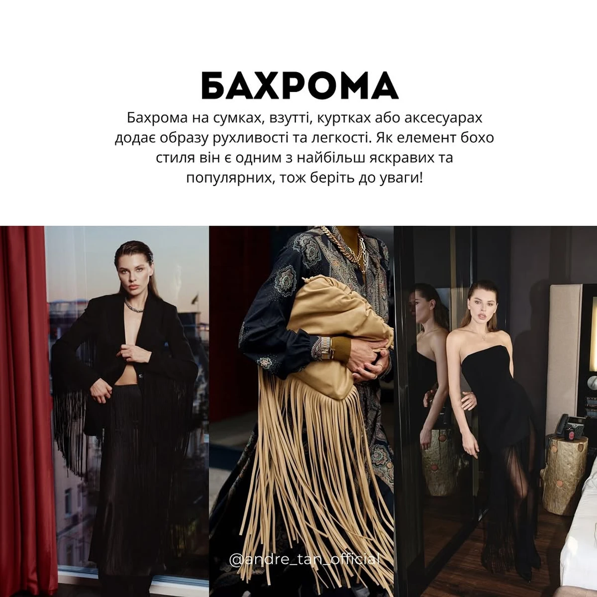 "Бахрома на сумках, взутті, куртках або аксесуарах додає образу рухливості та легкості. Як елемент бохо стиля, він є одним з найбільш яскравих та популярних, тож беріть до уваги!", - радить метр моди.
