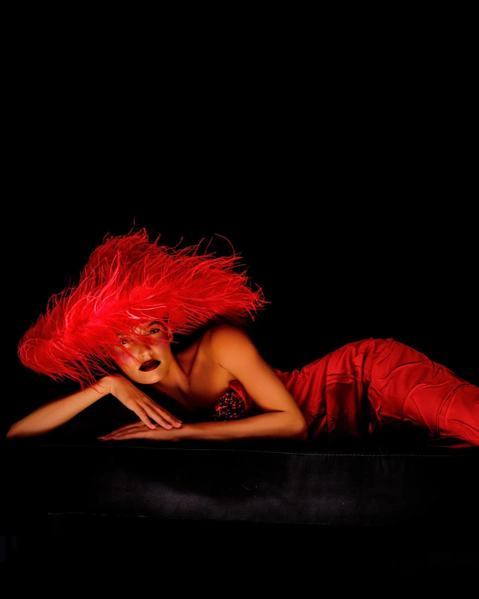 31-річна Андрес попозувала в елегантній червоній сукні та з пір'ям на голові.