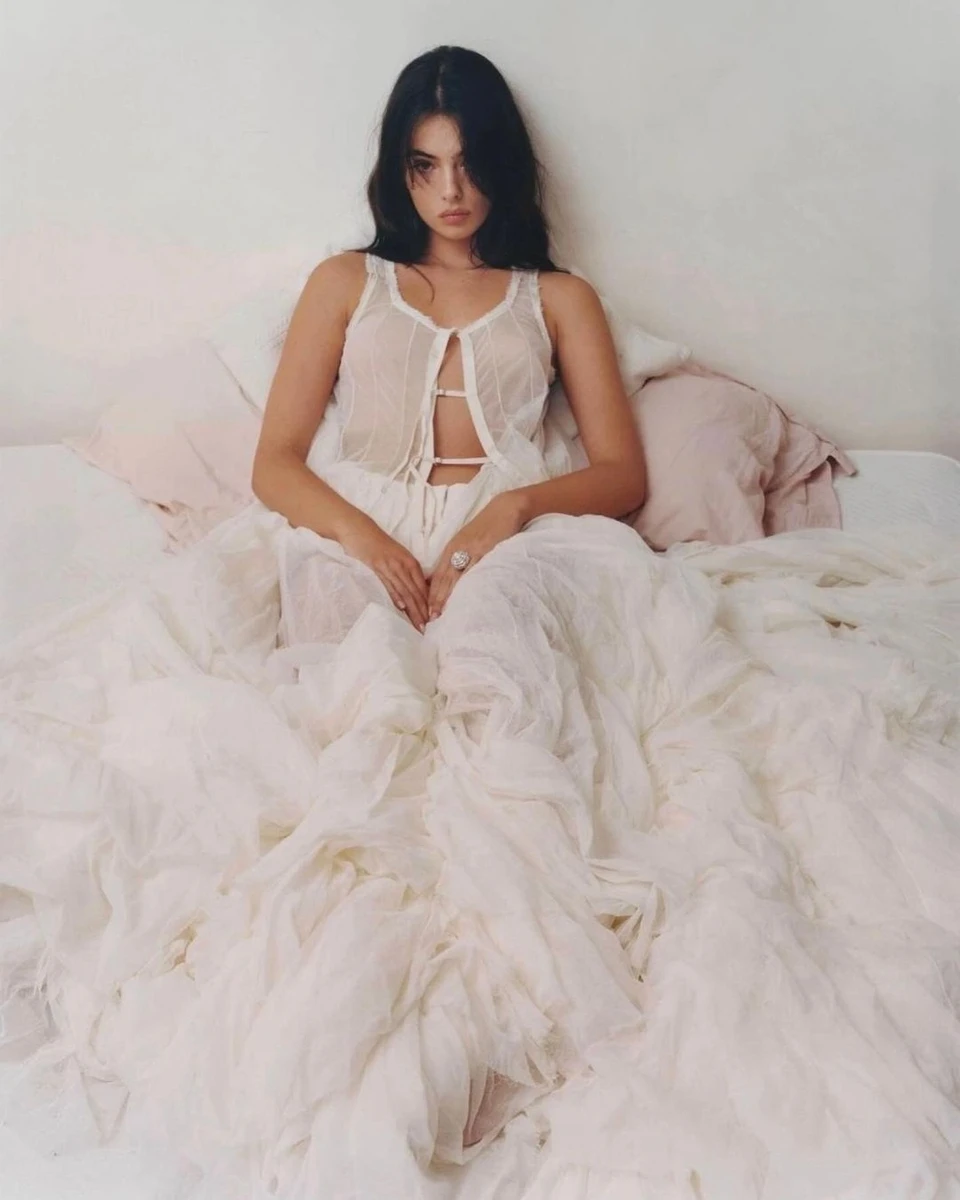 Дева Кассель для нового фотосету поніжилася на матрасі та посвітила грудьми в напівпрозорій сукні