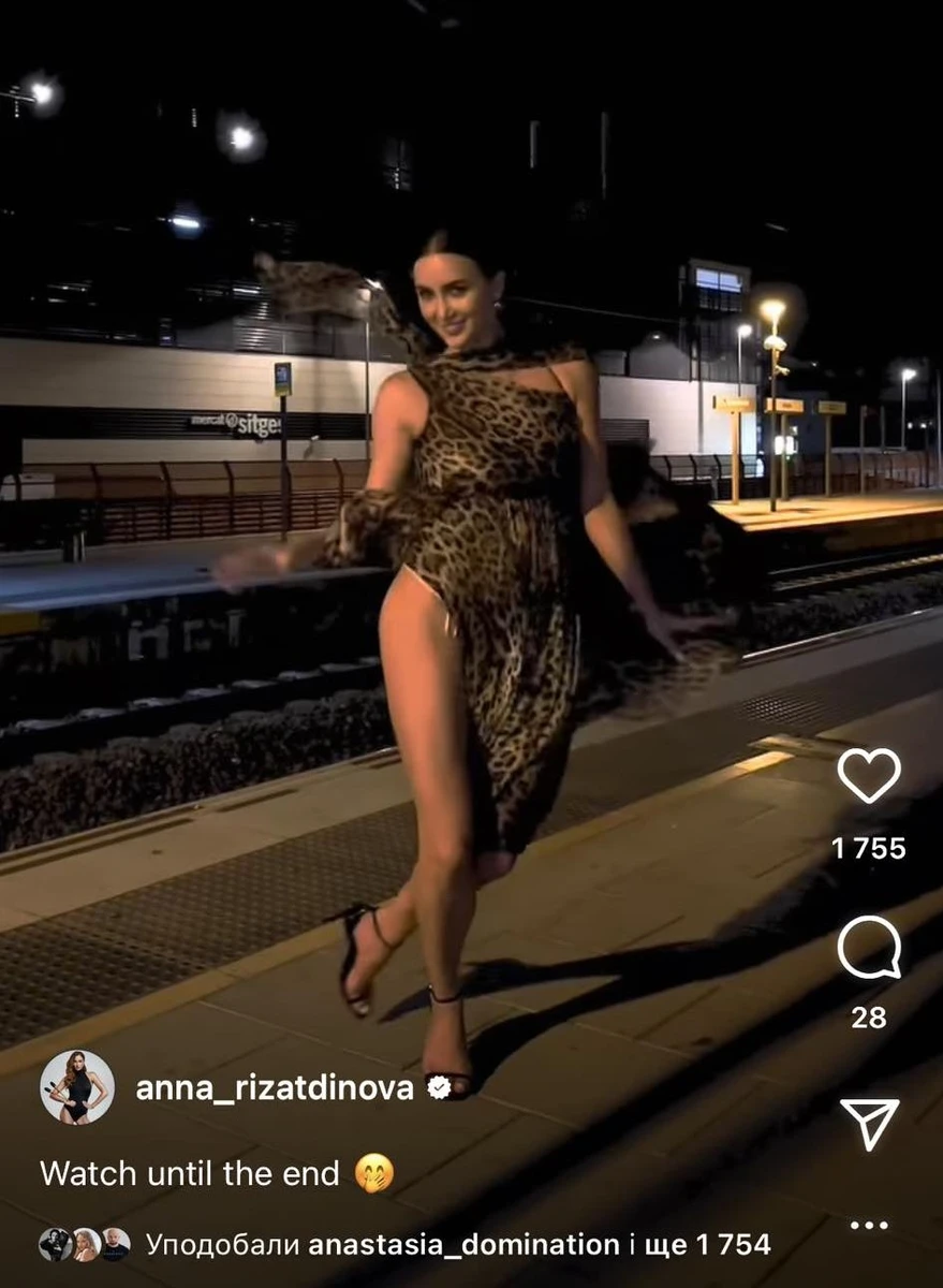 Різатдінова у леопардовій сукні стала в вертикальний шпагат назустріч потягу. ВІДЕО