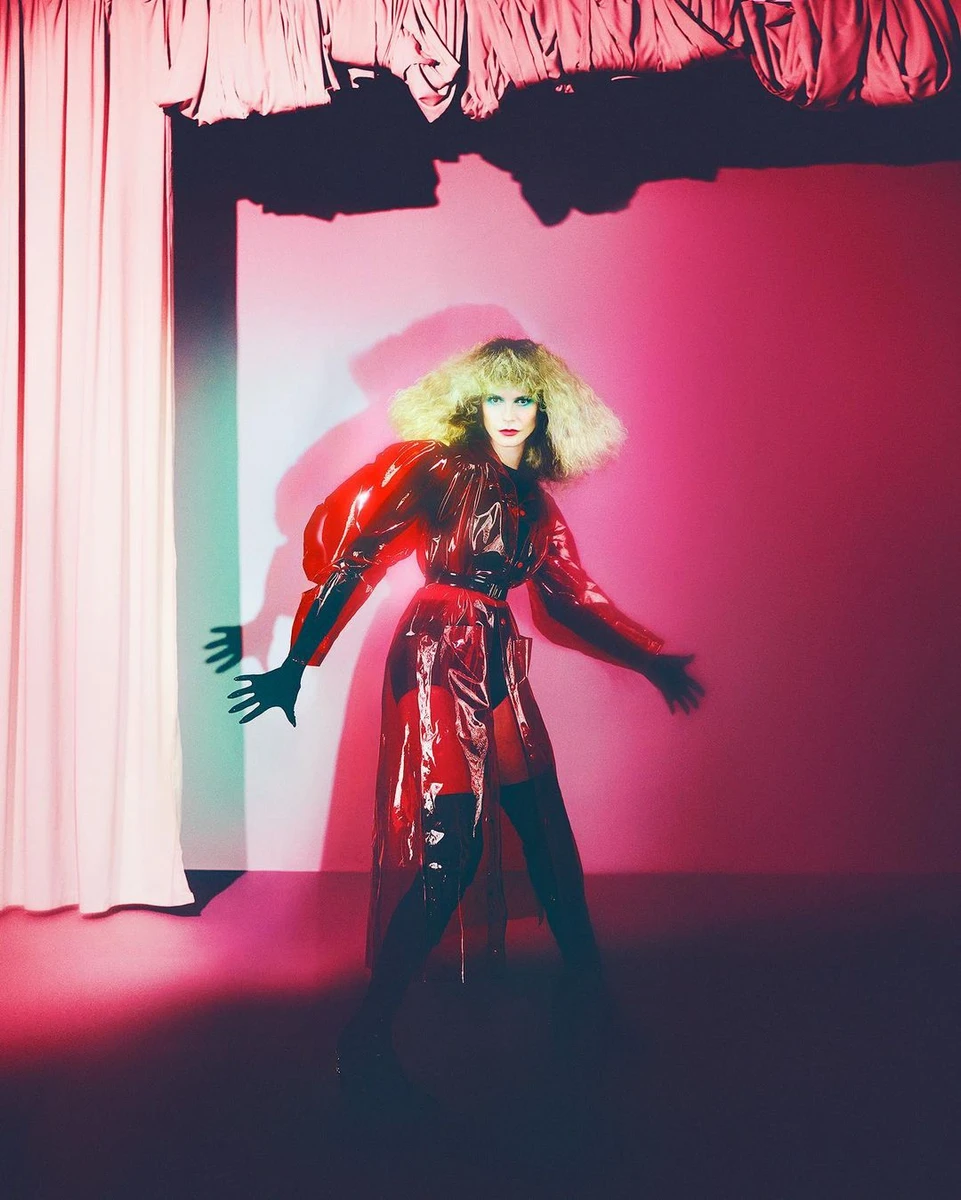 Модель приміряла на себе цікаві аутфіти у стилі 80-х. Їй зробили яскравий макіяж, а на голові пишний начіс.