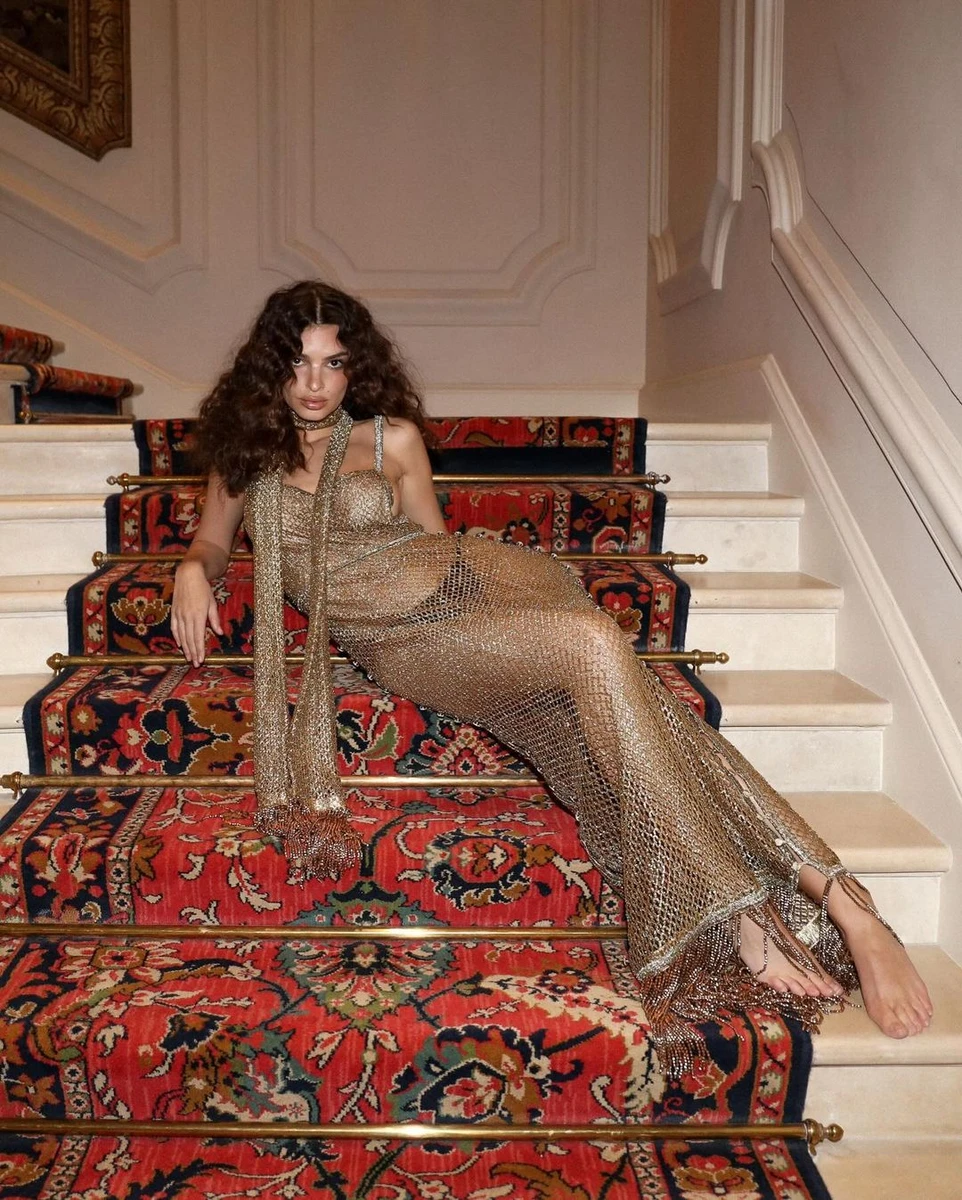 Наприклад, ось ця сітчаста максі сукня з додатковою бахромою знизу. Емілі максимально відкрита зі своїми прихильниками, тому обирає відповідне спіднє для цього образу.