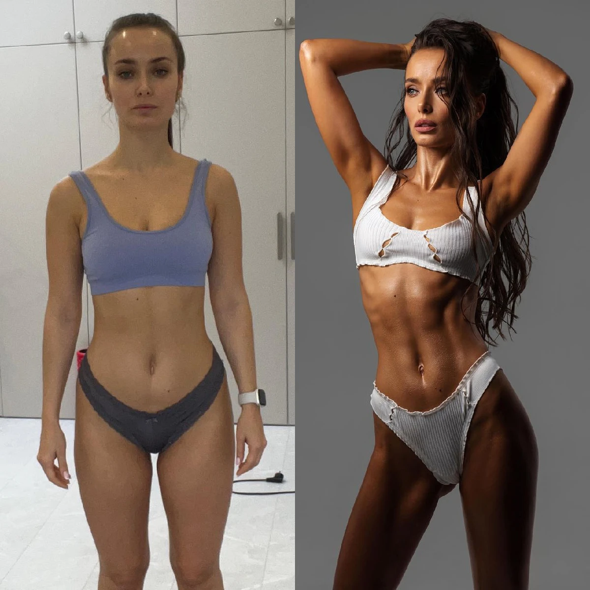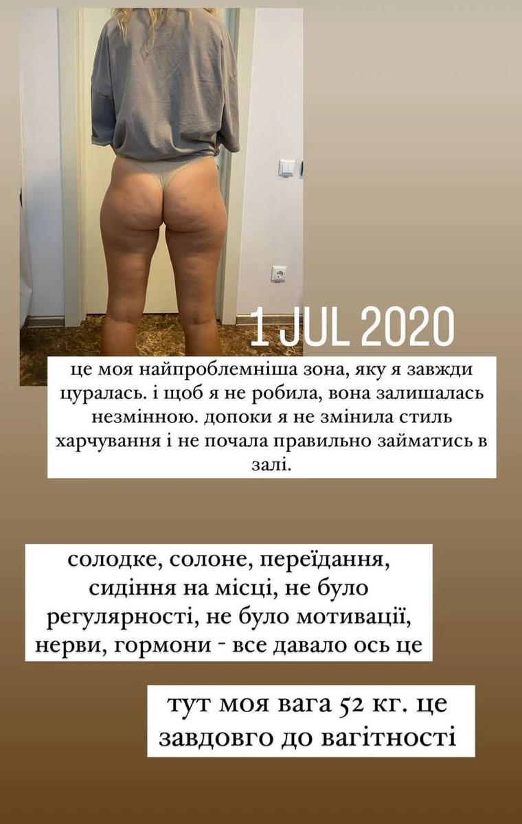 До вагітності вона важила 52 кілограми при зрості 165 і скаржилася на целюліт. У липні 2021-го блогерка народила сина, після чого поступово почала вводити спорт у своє життя.