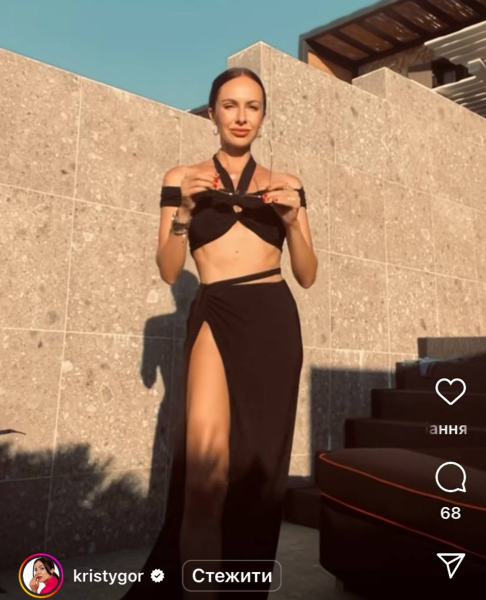 Вона опублікувала відео, на якому позує у чорному легкому костюмі топі та спідниці з розрізом у всю довжину.