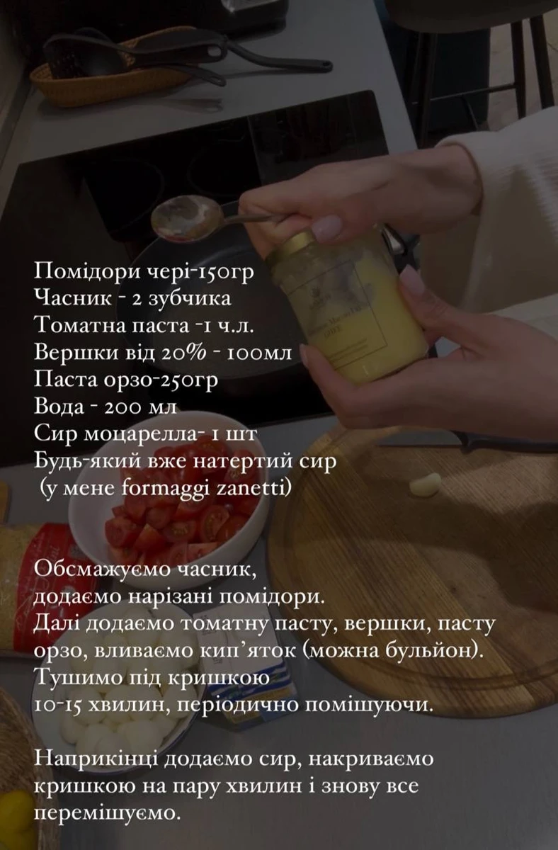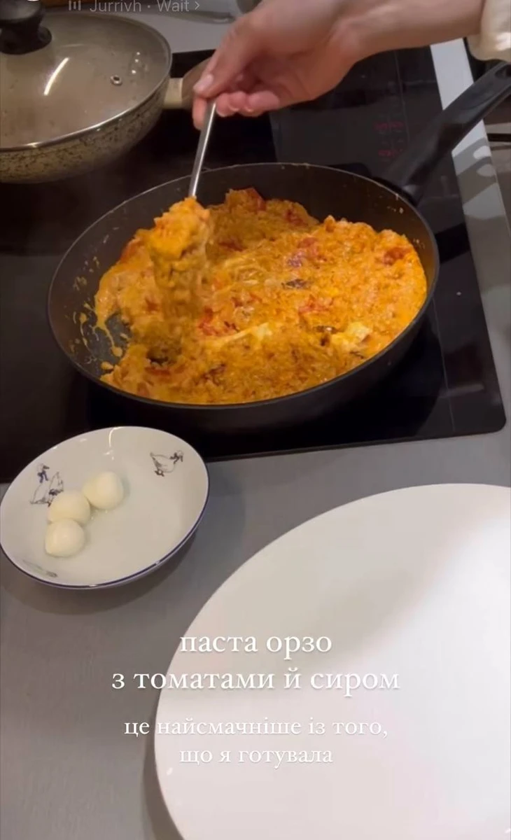 "Обсмажуємо часник, додаємо нарізані помідори. Далі додаємо томатну пасту, вершки, пасту орзо, вливаємо кип 'яток (можна бульйон). Тушимо під кришкою 10-15 хвилин, періодично помішуючи. Наприкінці додаємо сир, накриваємо кришкою на пару хвилин і знову все перемішуємо", - розказала Катя.