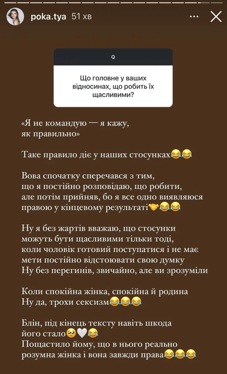 "Ну я без жартів вважаю, що стосунки можуть бути щасливими тільки тоді, коли чоловік готовий поступитися і не має мети постійно відстоювати свою думку. Не без перегинів, звичайно, але ви зрозуміли. Коли спокійна жінка, спокійна й родина. Ну да, трохи сексизм. Блін, під кінець тексту навіть шкода його стало. Пощастило йому, що в нього реально розумна жінка і вона завжди права", - підсумувала Катя.