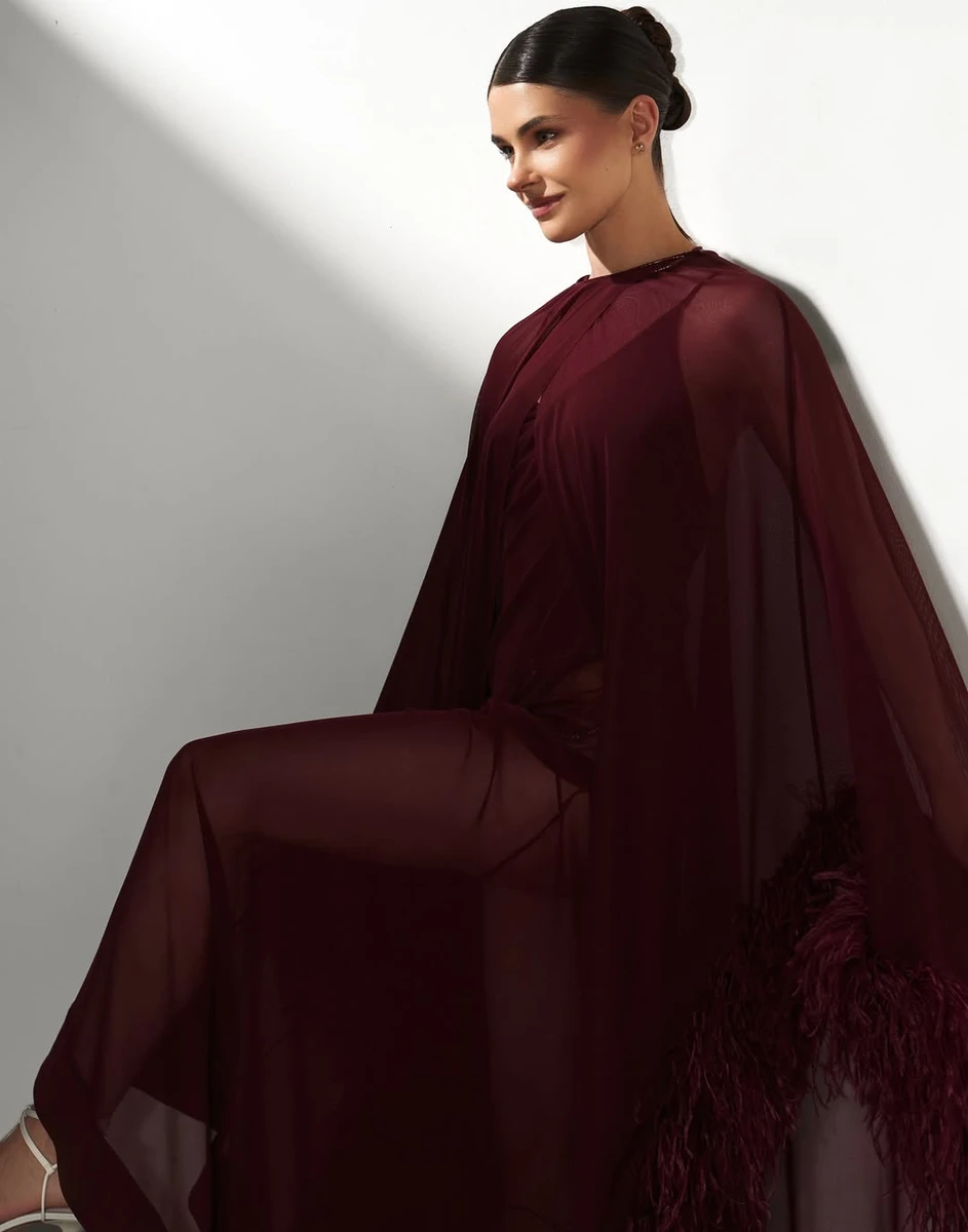 Для світлин іменинниця обрала розкішний образ, який складався з сукні на бретелях з кроше кольору бургунді або черрі-ред від бренду The Coat та з накидки такого ж кольору, прикрашеної пір'ям.