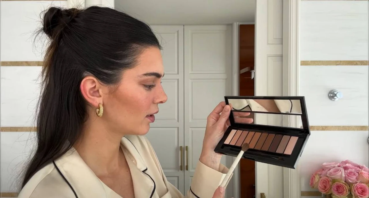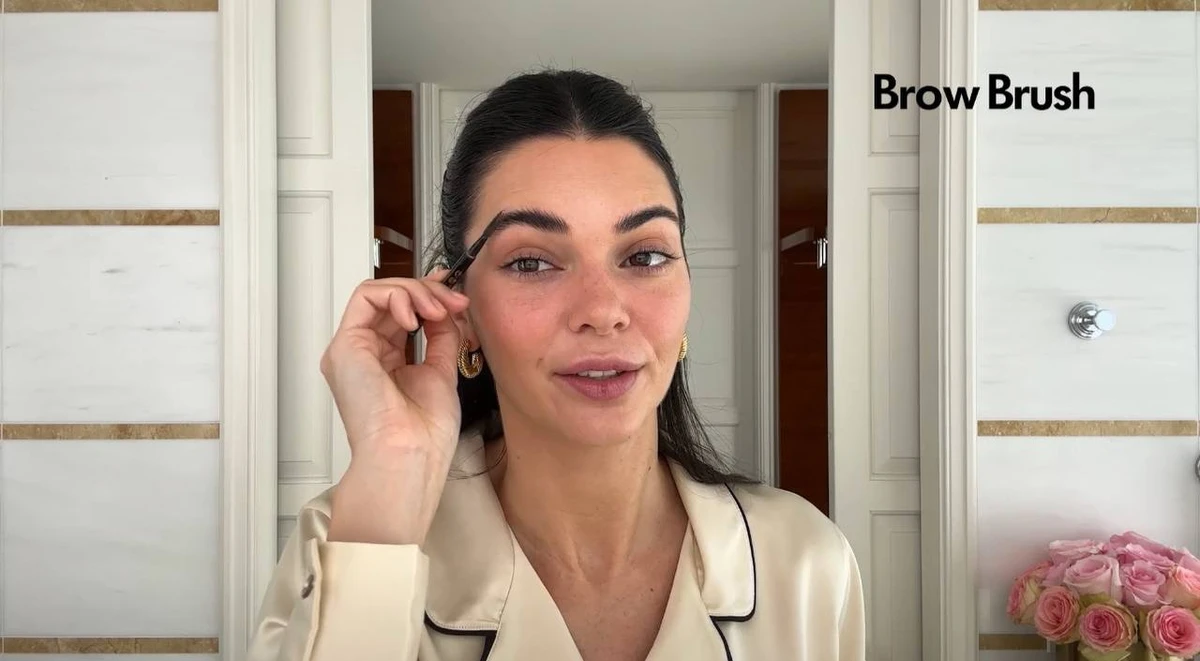 Після нанесення основи Дженнер підфарбовує брови олівцем і завершує мейк пудрою та тінями для повік.