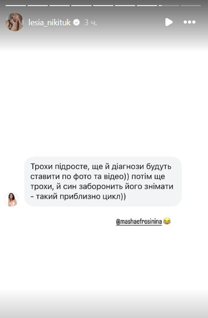 До речі, після того, як Леся поділилася фото з сином, деякі коментатори почали розмірковувати над тим, що хлопчик виглядає надто великим для свого віку. У сторіс Леся зізналася, що має змішані почуття щодо таких коментарів.