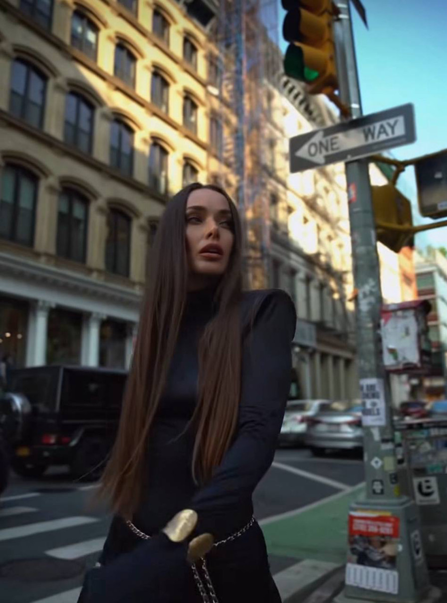 У своєму Instagram вона показала фрагмент відео, де в обтислій чорній сукні ефектно пройшлася кварталами мегаполісу.