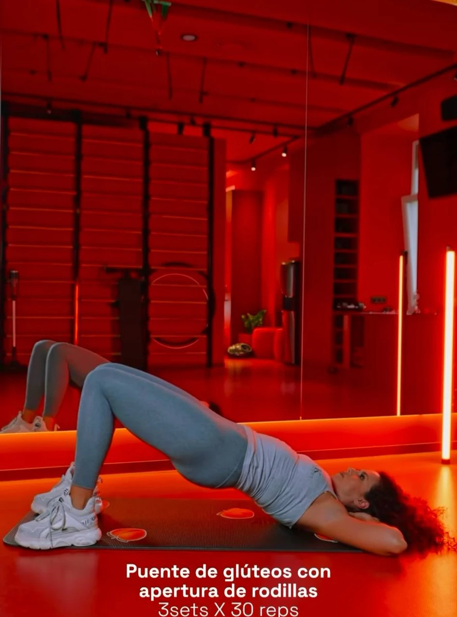 Лягайте на спину, зігнувши коліна і розмістивши ступні на підлозі. Підніміть стегна, утворюючи прямий кут від плечей до колін, і на верхній точці руху розведіть коліна в сторони, напружуючи сідниці. Поверніть коліна до центру і опустіть стегна.