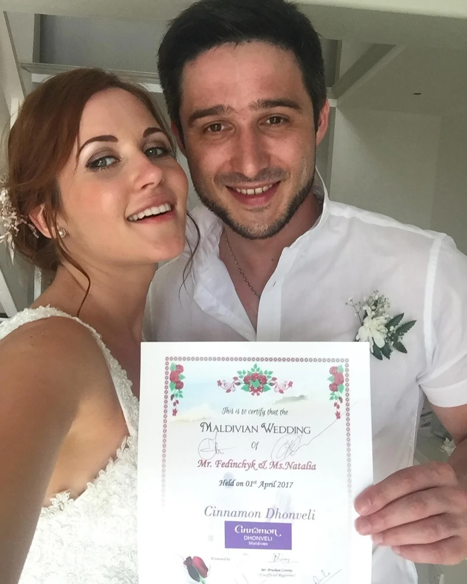 "Сьогодні у нас річниця весілля. 1.04.2017 року на Мальдівах ми побралися. Лише він і я. Ніяких гостей, це було свято лише для нас двох, наше перше (і головне весілля). Потім ще були декілька весіль з гостями/розписом. Потім ще весілля на 4-ту річницю… і мені хочеться ще", – зізналася Денисенко.
