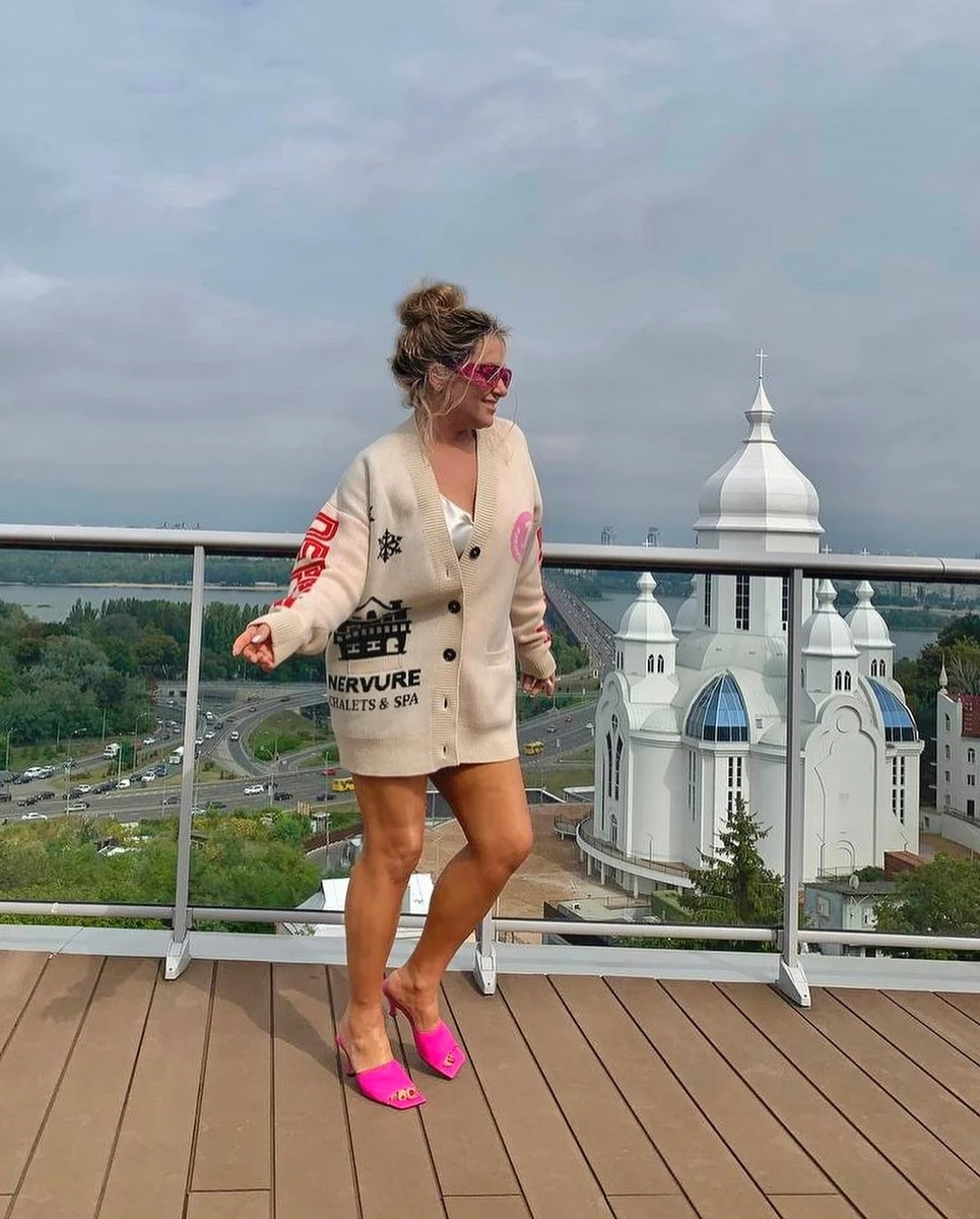 На фото Могилевська позує у короткій сукні-нічнушці, поверх якої вона одягнула теплий кардиган з написами. Образ вона доповнила рожевими сонцезахисними окулярами та рожевими босоніжками на підборах.