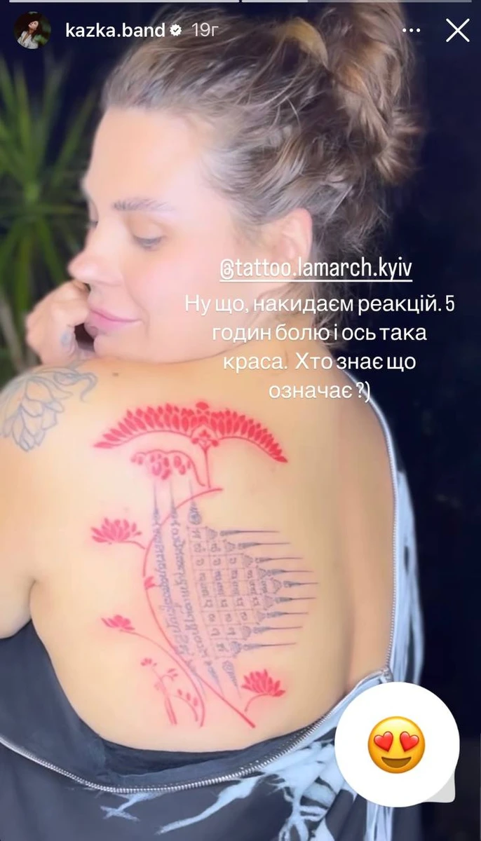 Вона показала свою спину, на якій набила червоний орнамент та текст, схожий на буддійську мантру.