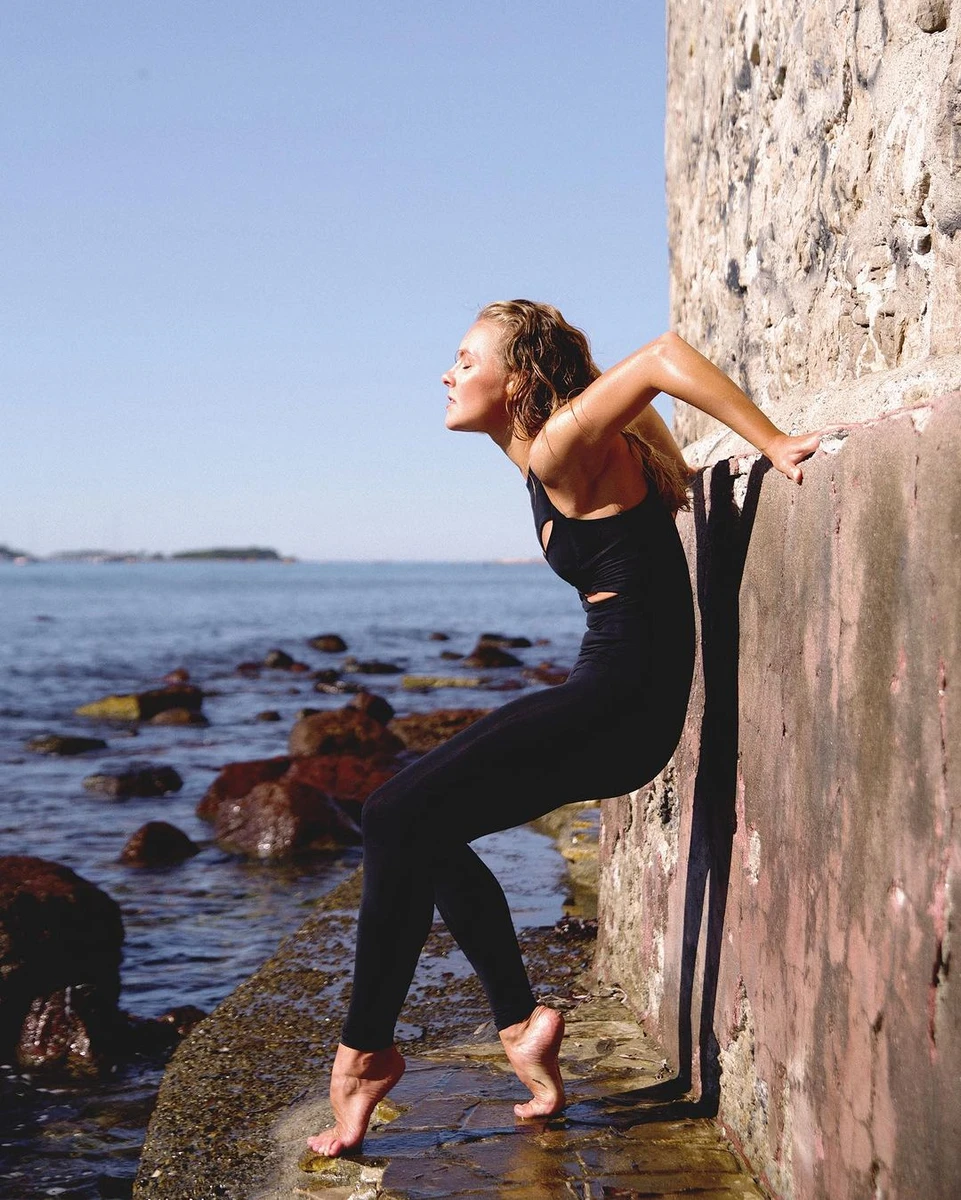 Шоптенко у чорних луках із голим животом потримала рівновагу на тлі каміння. ФОТО
