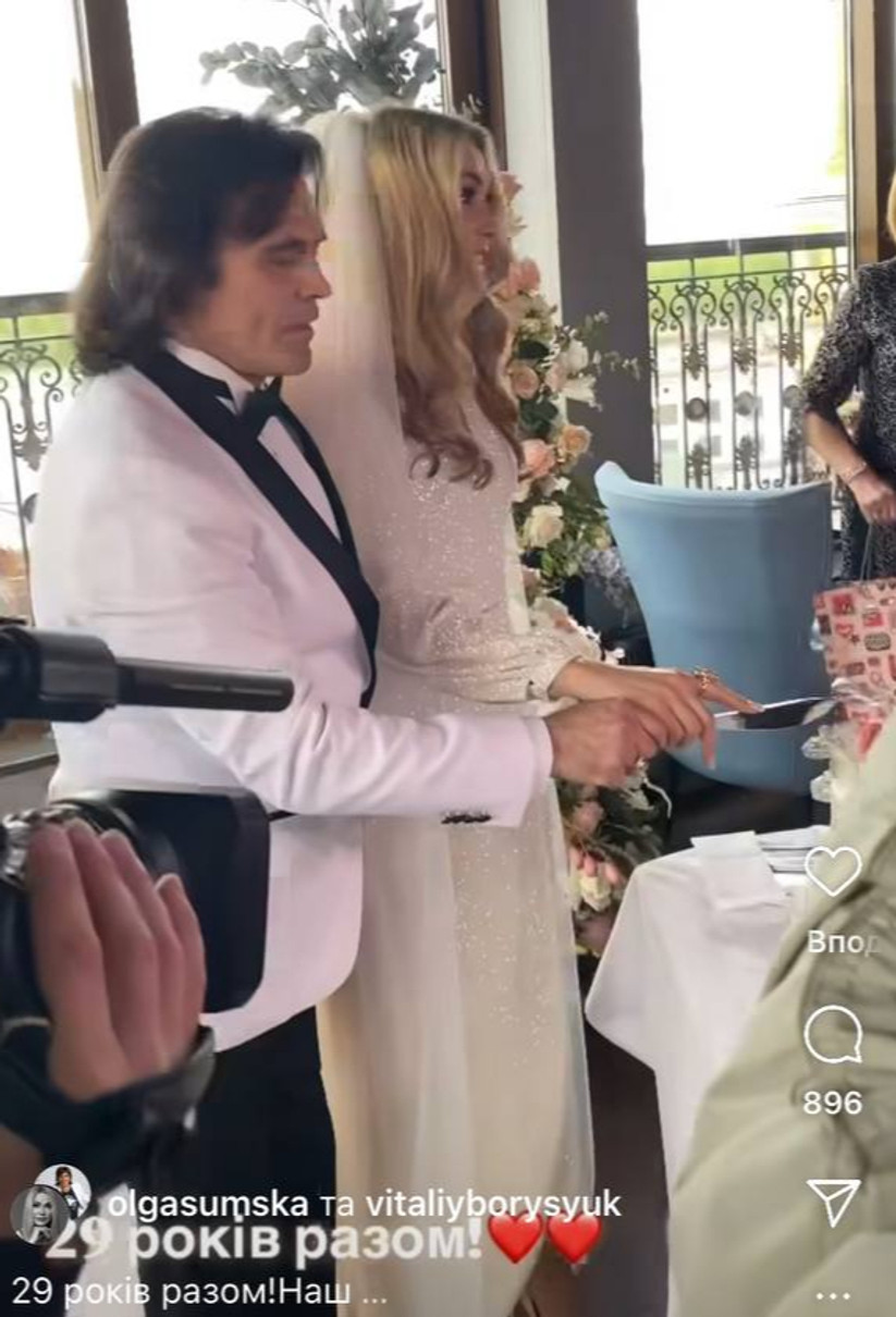 58-річна акторка Ольга Сумська привітала свого чоловіка, 61-річного актора Віталія Борисюка з 29-річчям шлюбу кадрами їхнього другого весілля.