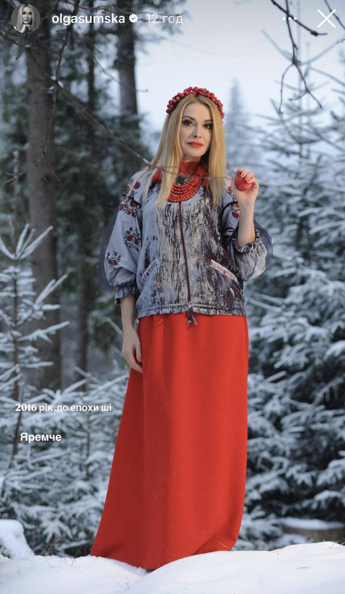 Як зазначила зірка у Instagram, зйомка пройшла за температури мінус 15 градусів морозу. Утім це не завадило Ользі, вбраній у розцяцьковану квітами блузу і спідницю, невимушено позувати серед засніженого лісу, вдаючи, ніби їй анітрішечки не холодно.