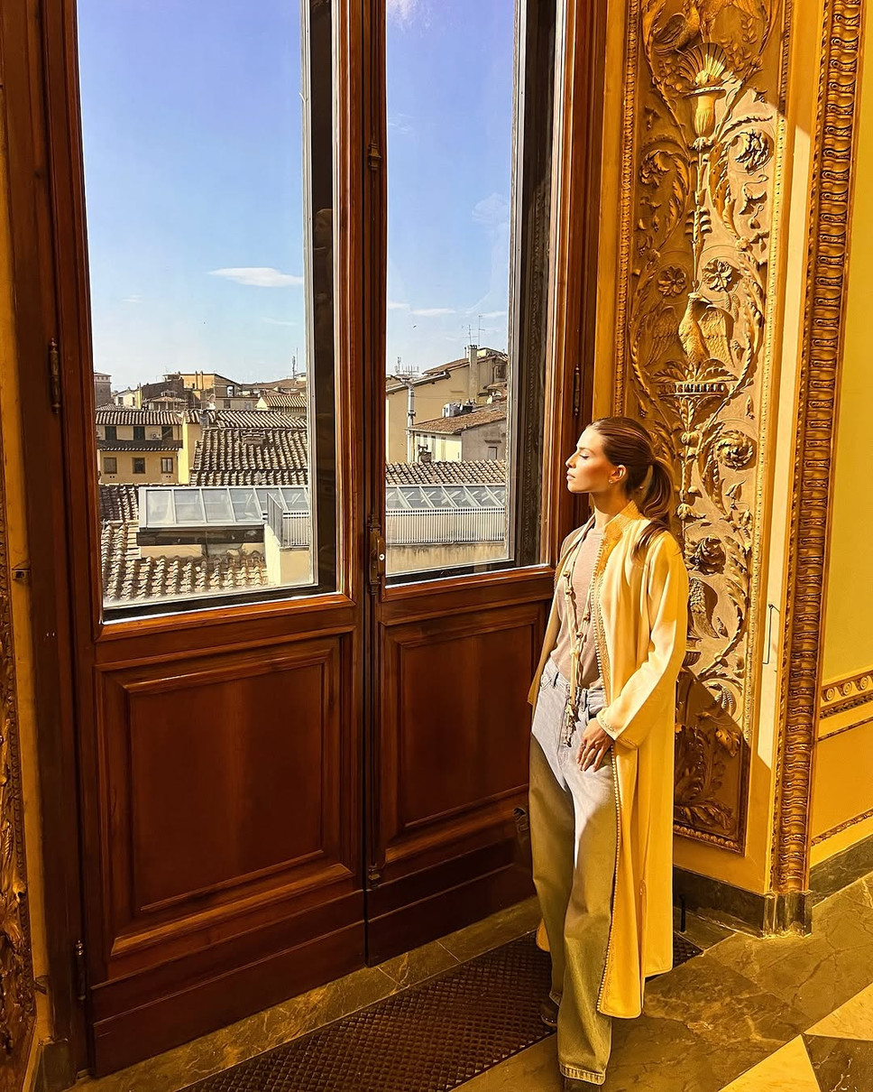 Софія в модному кольорі цієї весни погуляла галереєю Уффіці у Флоренції