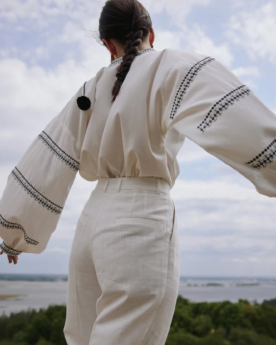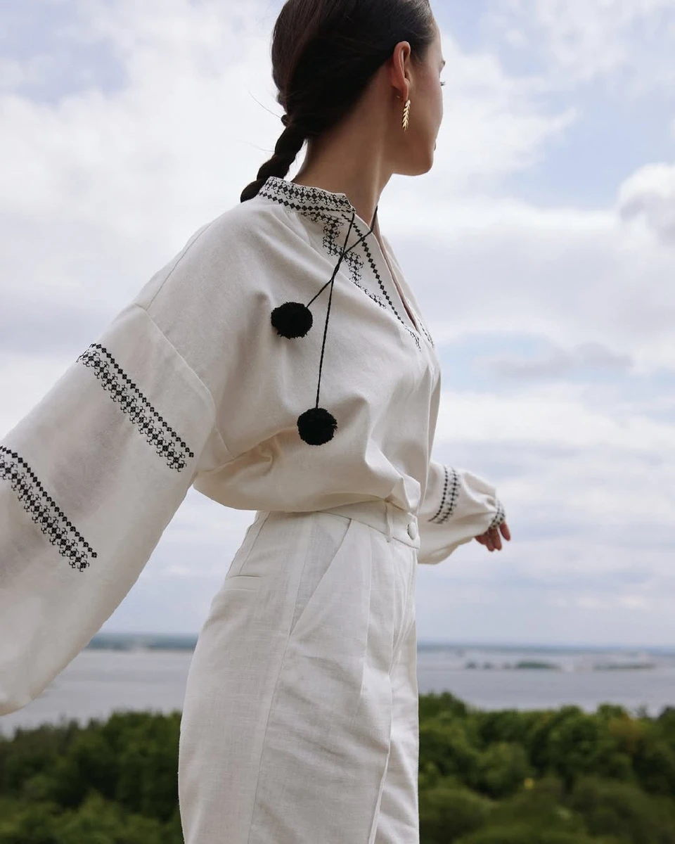 Блогерка поєднала вишиванку з білими штанями. До речі, вийшов доволі святковий образ