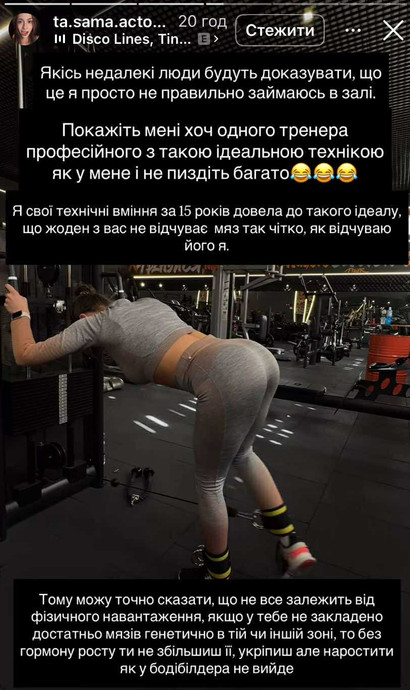 "Трішки мотивації для вас, мені 30 років: 15 років займаюсь в залі, 0 допінгу (типу гормони росту, стероїди і т д), 0 хірургічних втручань чи уколів краси (я тільки в 30 вперше вколола ботокс собі)", - написала вона.