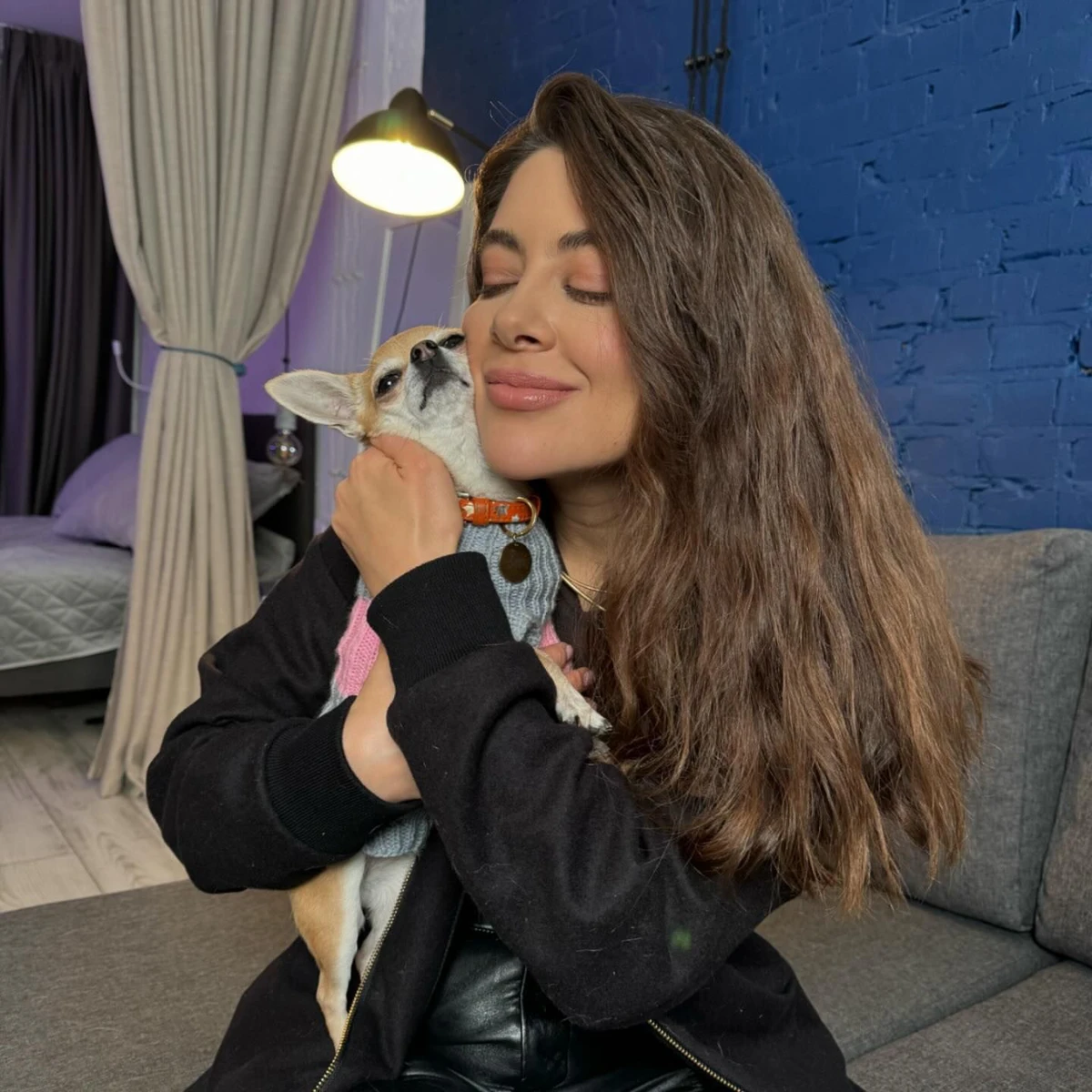 На знімку 32-річна Раміна закарбувала теплі обійми зі своїми домашніми улюбленцями породи чіхуахуа.