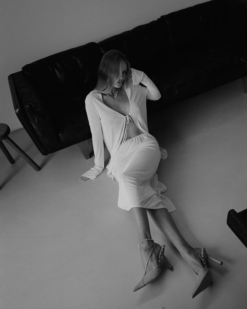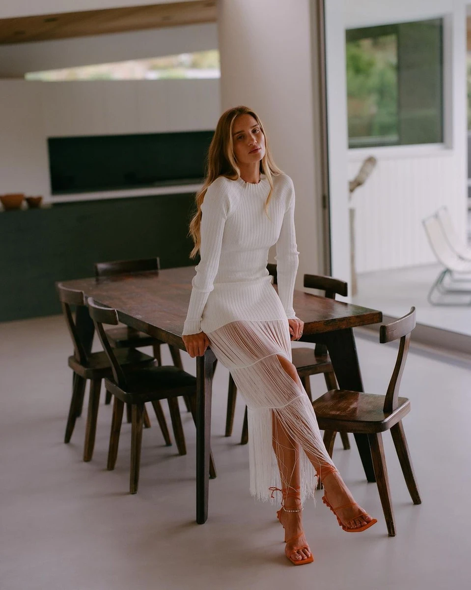 36-річна британська модель Розі Хантінгтон-Вайтлі у новій фотосесії попозувала у будинку в обтислому вбранні.