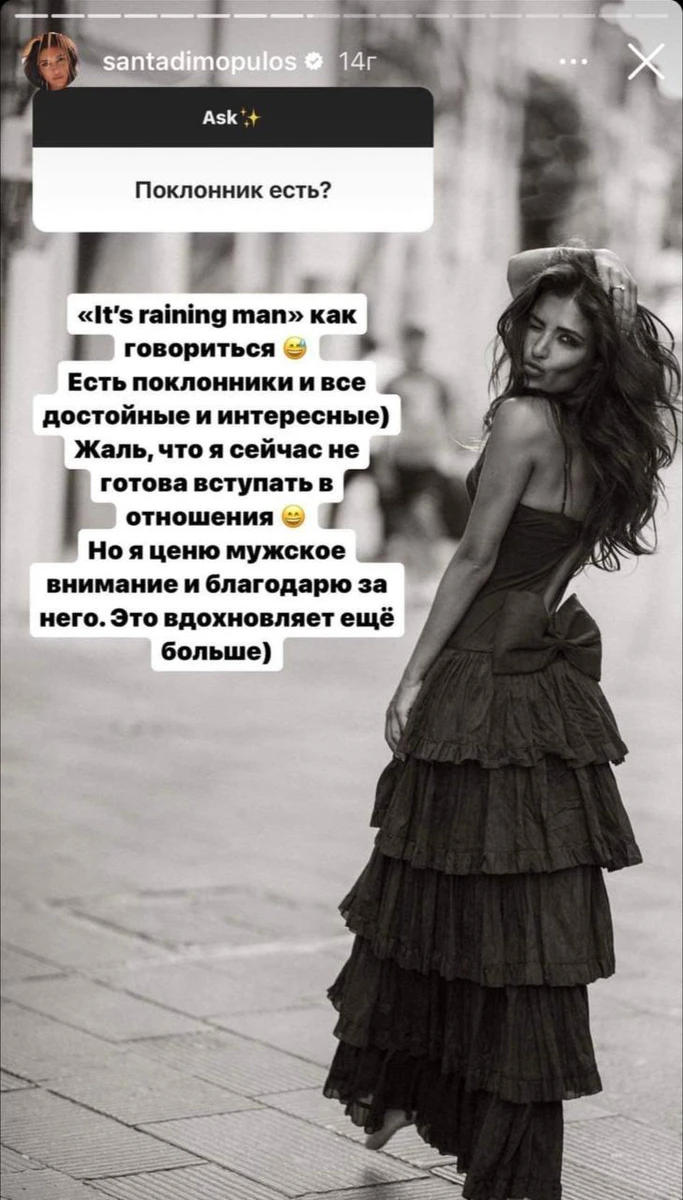 "It`s raining man (дощ з чоловіків, - ред.)", як говориться. Є прихильники і всі гідні та цікаві. Шкода, що я зараз не готова починати стосунки. Але я ціную чоловічу увагу і дякую за неї. Це надихає ще більше", - зазначила Санта.