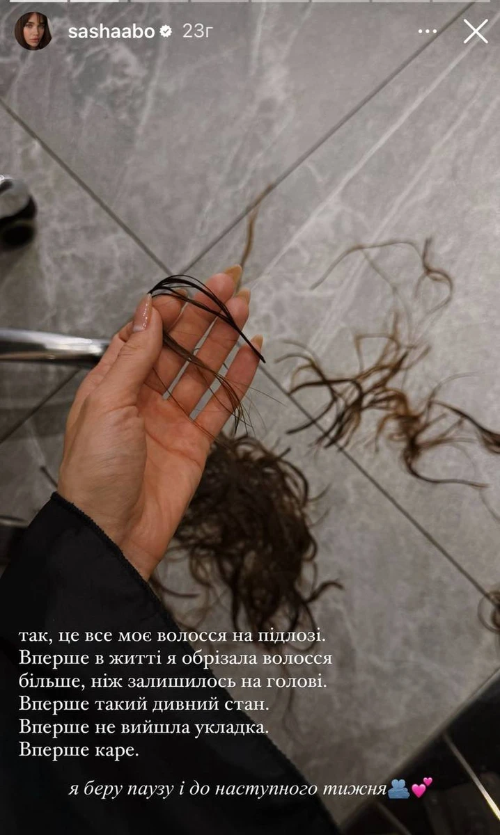 "Так, це все моє волосся на підлозі. Вперше в житті я відрізала волосся більше, ніж залишилося на голові. Вперше такий дивний стан. Вперше не вийшла укладка. Вперше каре", - написала вона.