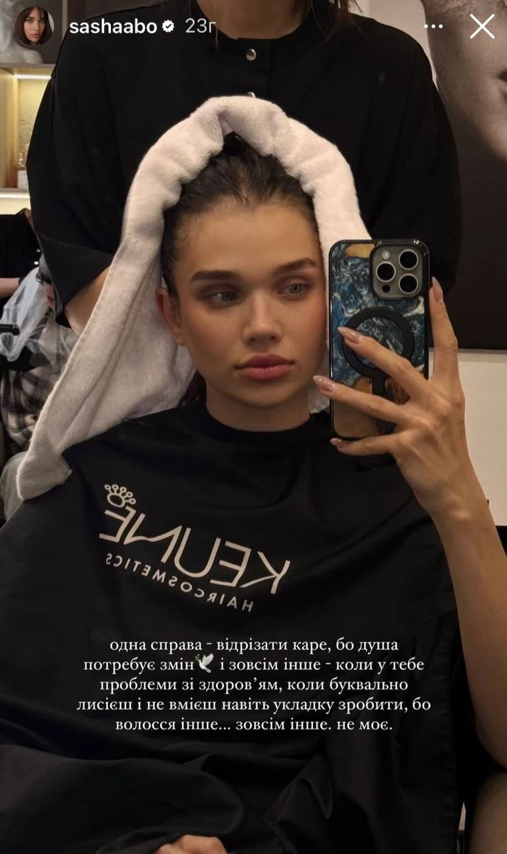"Одна справа - відрізати каре, бо душа потребує змін. І зовсім інше, коли у тебе проблеми зі здоров'ям, коли буквально лисієш і не вмієш навіть укладку зробити, бо волосся інше. Зовсім інше, не моє", - зауважила Олександра.