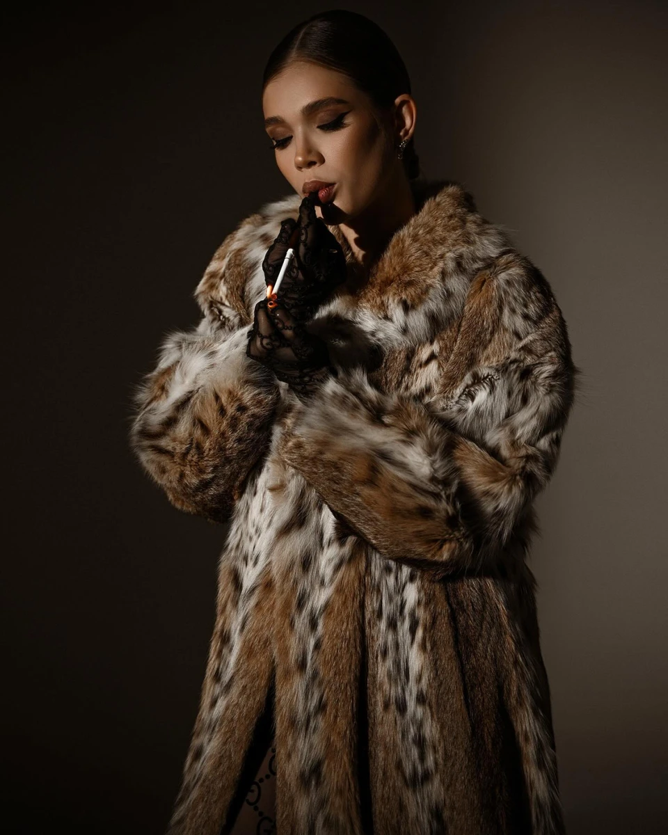 Цього разу блогерка, яка надає перевагу теплим домашнім зйомкам, одягнула шубу на голе тіло і попалила з мундштука.