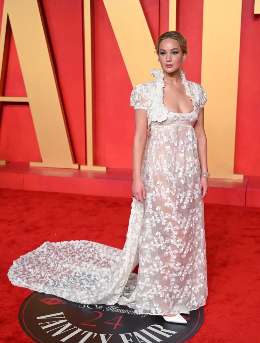 У березні 2024 року 33-річна оскароносна акторка Дженніфер Лоуренс з’явилася на вечірці Vanity Fair у розкішному вінтажному вбранні. Вона обрала сукню Givenchy від кутюр з колекції осінь-зима 1996 року. Її головна родзинка – глибоке, широке декольте, напівпрозора тканина та довгий шлейф.