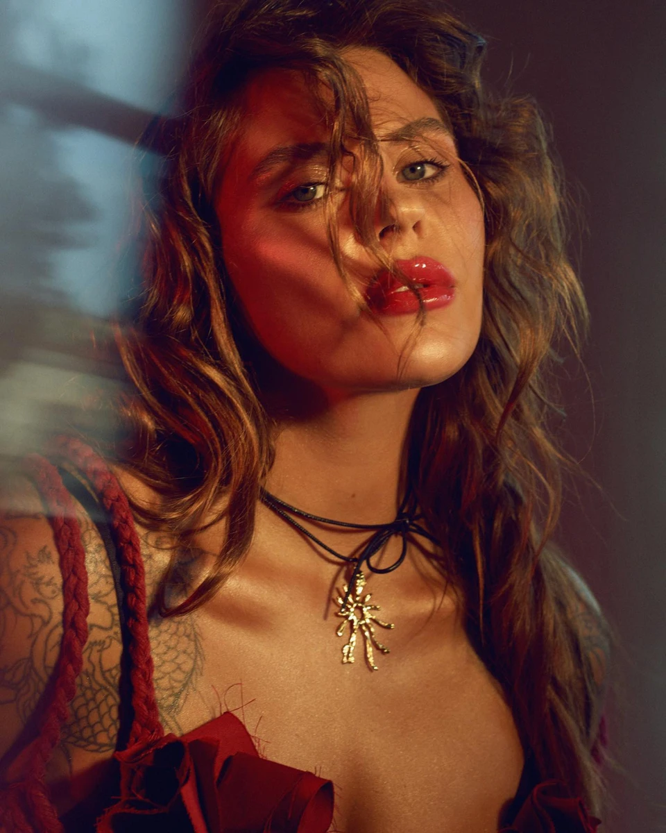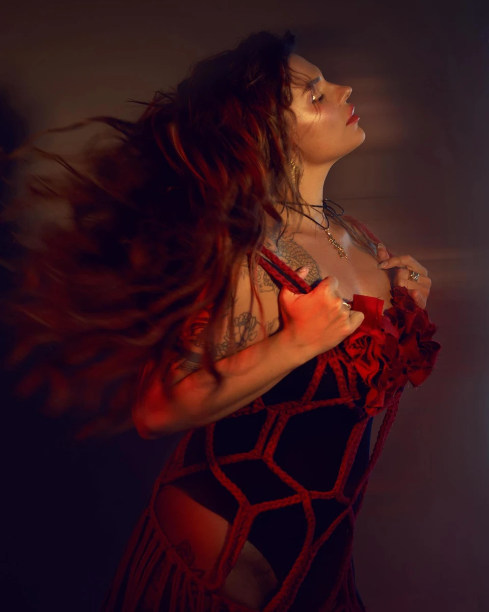 Заріцька у боді та червоному макраме вигнула спокусливі форми для палких фото