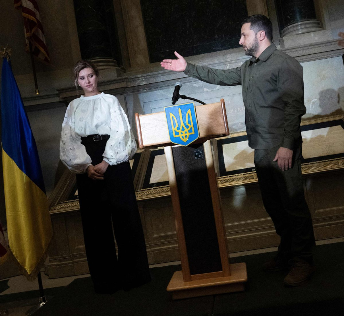 Олена Зеленська любить вишиванки і часто одягає їх на важливі міжнародні зустрічі. Натомість Володимир Зеленський від початку повномасштабного вторгнення перейшов на мілітарі стиль: він віддає перевагу штанам-карго, худі чи сорочками кольору хакі.