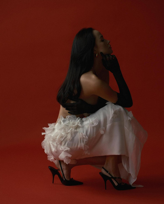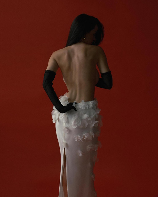 На знімках 29-річна блогерка елегантно повигинала спину, прикривши груди пальчатками.