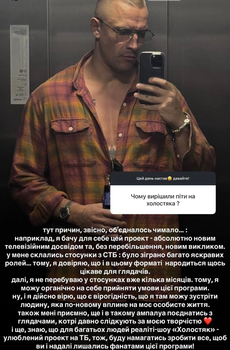 "Тут причин, звісно, обʼєдналось чимало: наприклад, я бачу для себе цей проєкт - абсолютно новим телевізійним досвідом та, без перебільшення, новим викликом. У мене склались стосунки з СТБ: було зіграно багато яскравих ролей, тому, я довіряю, що і в цьому форматі народиться щось цікаве для глядачів", - пояснив Тарас.