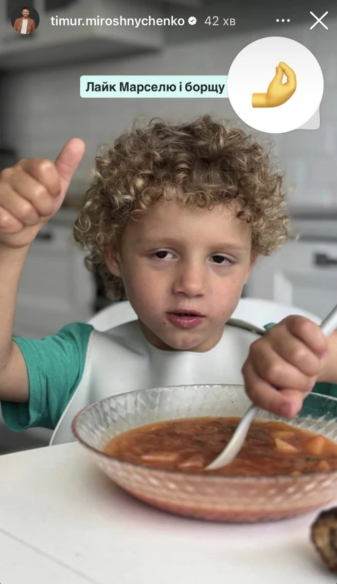 Телеведучий Тімур Мірошниченко, який нещодавно насмішив мережу ранковою зачіскою 9-річної доньки Ангеліни, присвятив серію світлин у Insta-сторіс 3-річному сину Марселю і його любові до борщу.