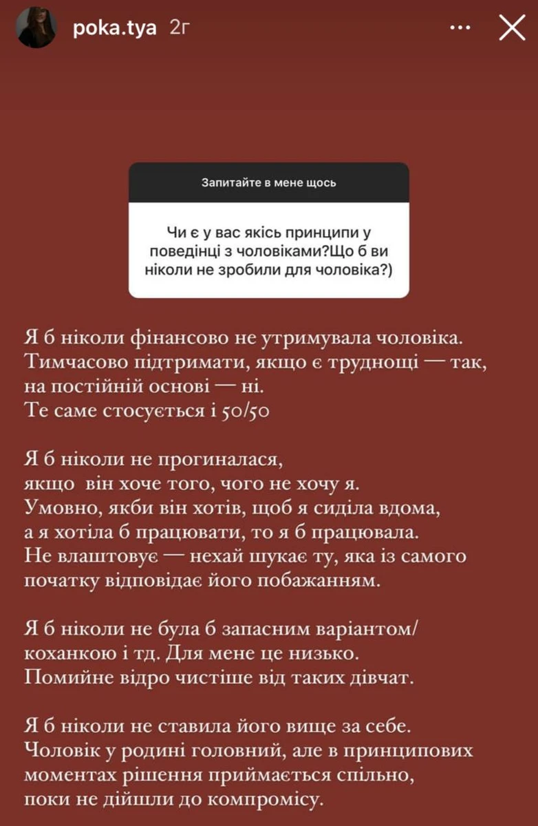 "Я б ніколи фінансово не утримувала чоловіка. Тимчасово підтримати, якщо є труднощі - так, на постійній основі - ні. Те саме стосується і 50/50 (йдеться про рівний бюджет, - ред.). Я б ніколи не прогиналася, якщо він хоче того, чого не хочу я. Умовно, якби він хотів, щоби я сиділа вдома, а я б хотіла працювати, то я б працювала", - зазначила Катя.