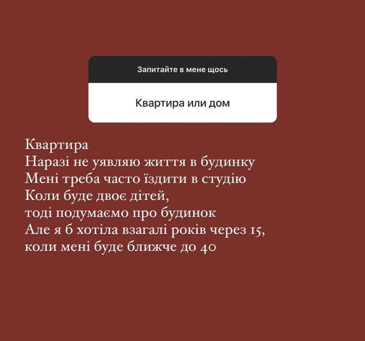 "Мені треба часто їздити в студію. Коли буде двоє дітей, тоді подумаємо про будинок. Але я б хотіла взагалі років через 15, коли мені буде ближче до 40", - відповіла дівчина на питання своїх підписників.