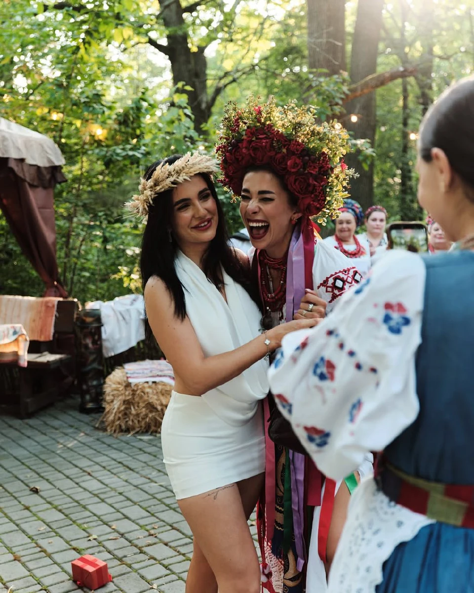 Неплях в українському костюмі та вінку з троянд схопила на руки Трінчер у міні та колоссі. Фото