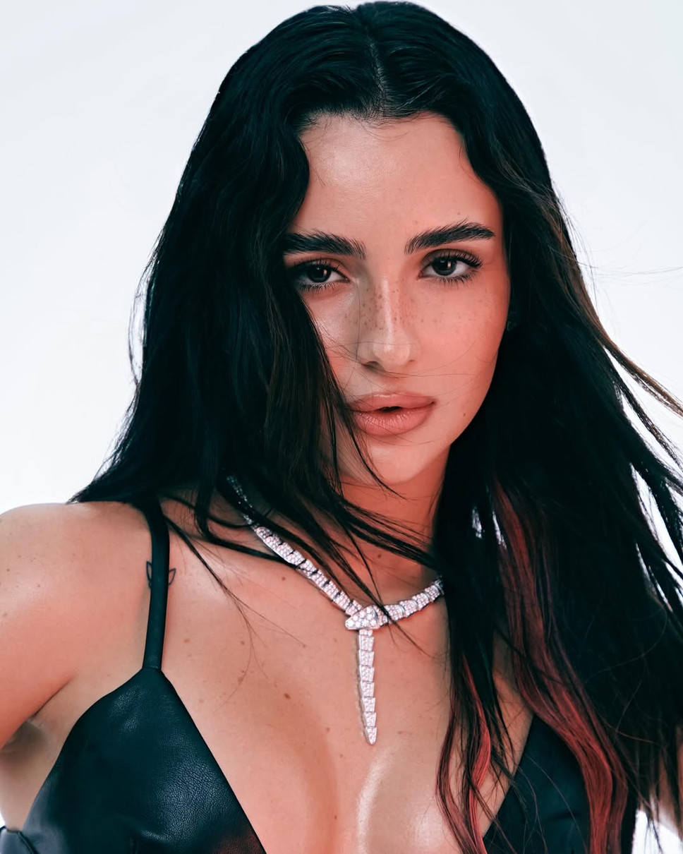 У своєму Instagram вона опублікувала пікантні фотографії у чорному спідньому. Шкіряний бюстгальтер мав декоративні ремінці, що перехрещувалися навколо талії.