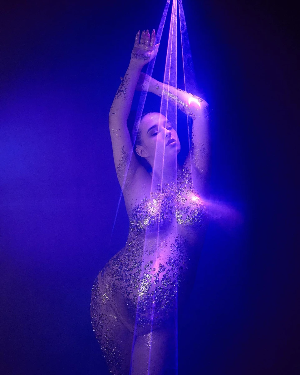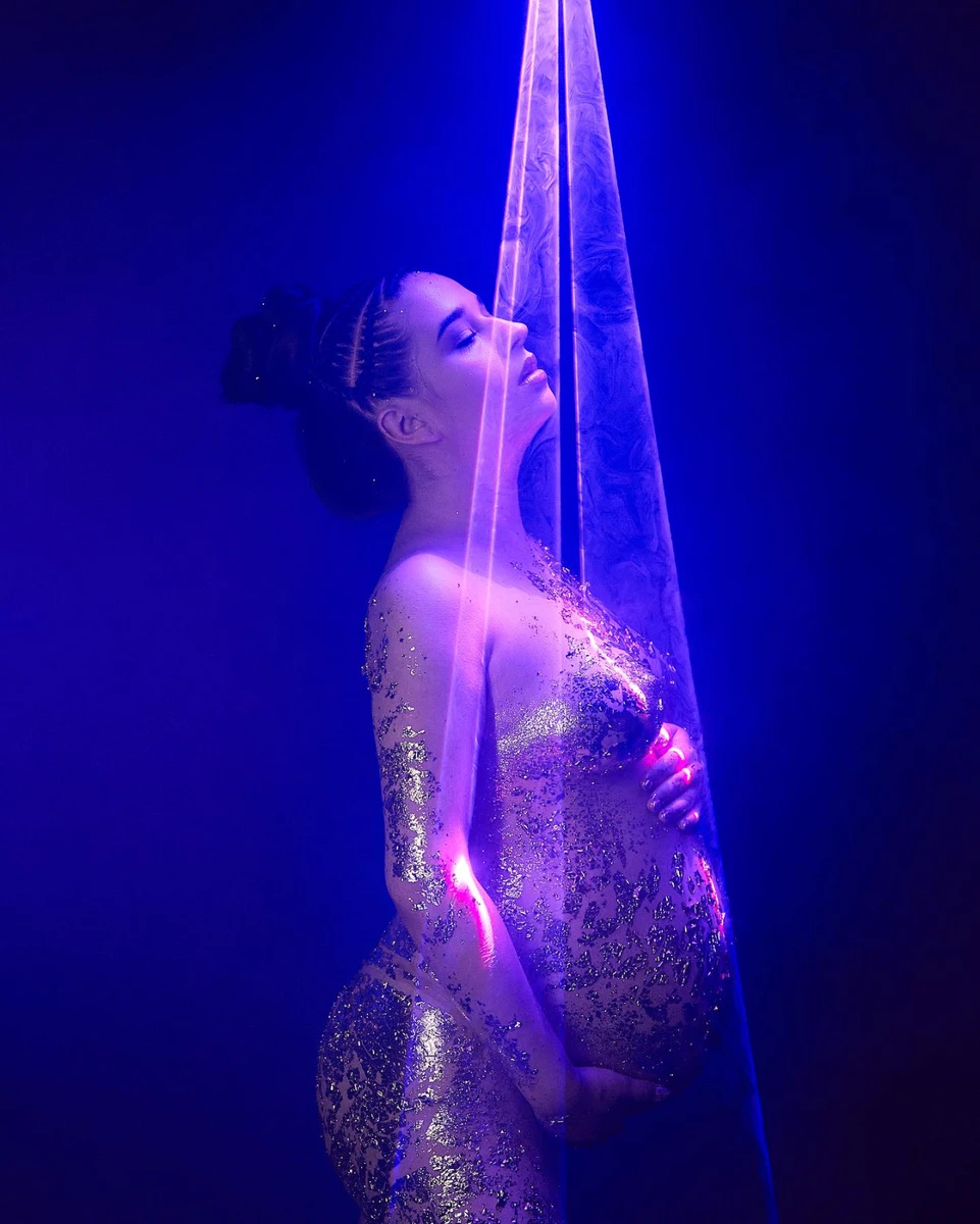 25-річна майбутня мама на 9-му місяці вагітності попозувала у неоному світлі зі шматками золота на тілі.