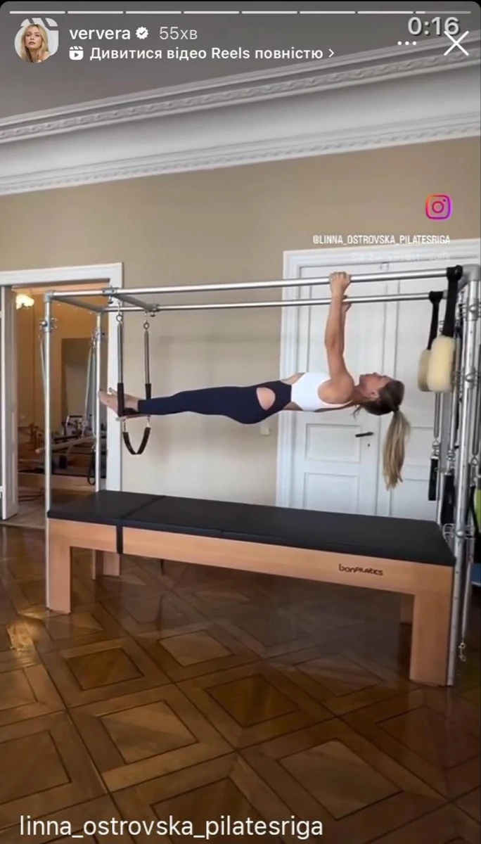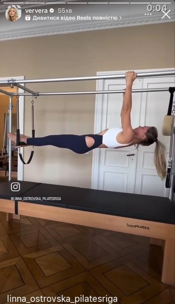 На кадрах 42-річна Віра у біло-синьому обтислому спортивному комбінезоні з вирізами на талії та стегнах підтягується на перекладинах на спеціальному обладнанні для пілатесу.