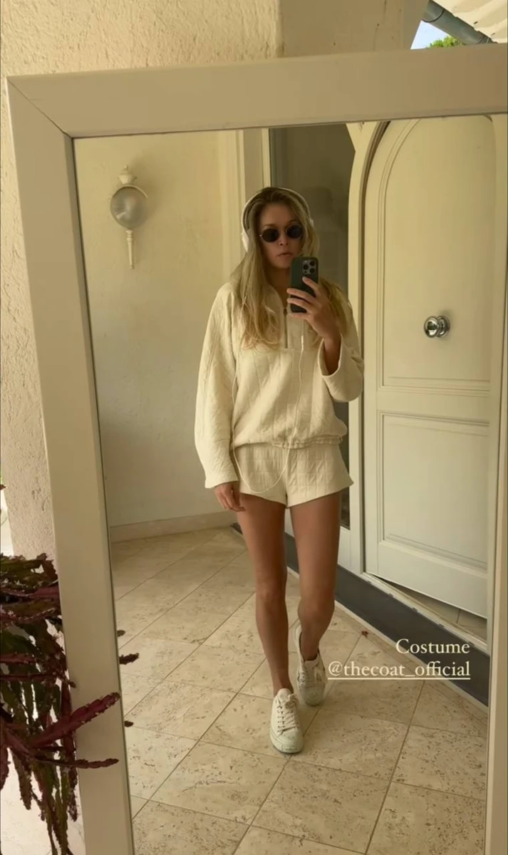 Брежнєва показалася у бежевому міні і доповнила образ окулярами та навушниками.