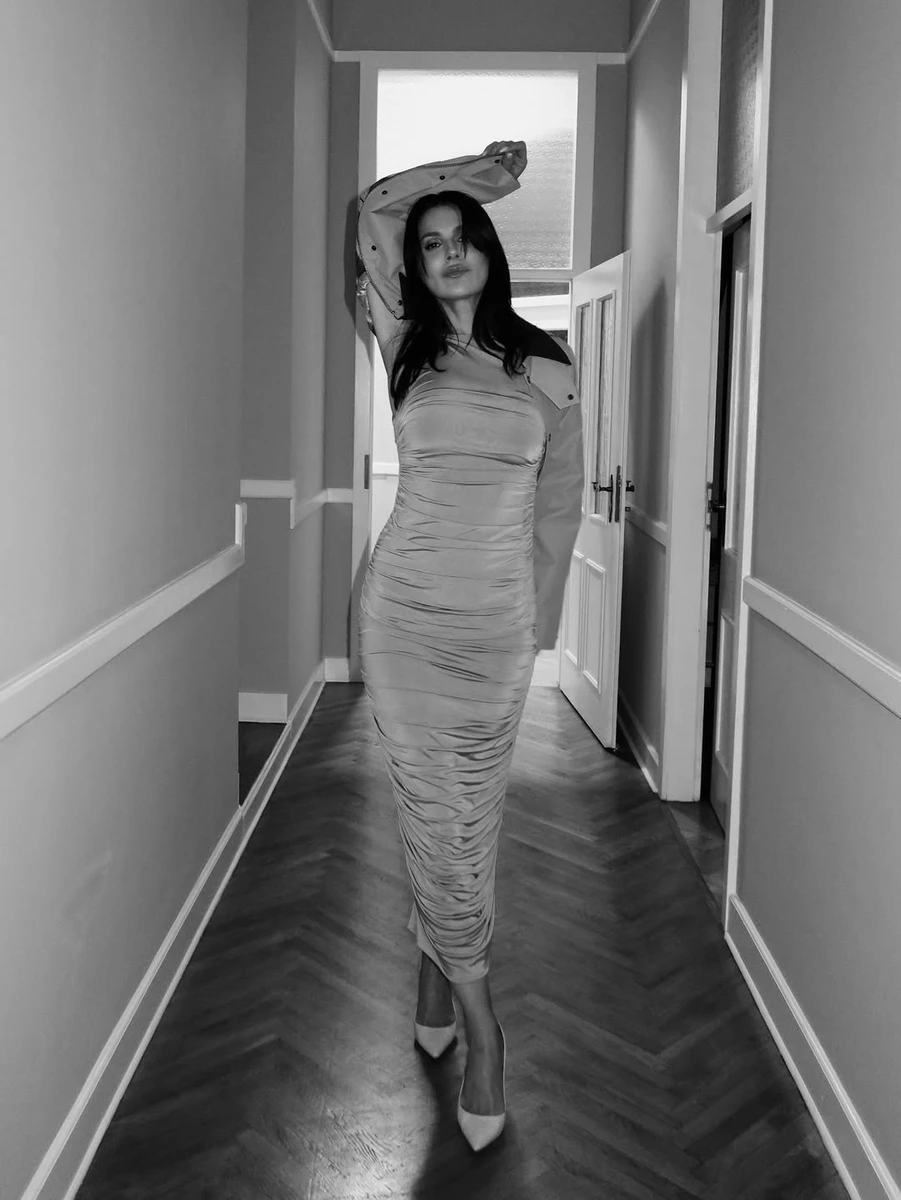 "Спіймана в моменті": Єфросиніна у нюдовій сукні з драпіруванням наробила ефектних фото в коридорі