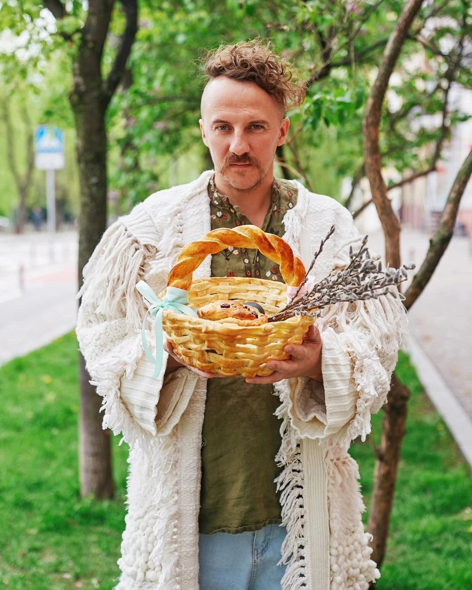 На фото Клопотенко позує джинсах, вишиванці та в'язаній накидці в руках з кошиком, який випечений з тіста.