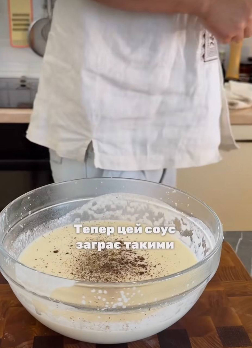 "Стан 2 — цибуля + 20 г вершкового масла + 15 мл олії — обсмажте. Додайте 500 г капусти й 600 мл води, варіть 15 хв. Вершки (200 мл), спеції, мускат, червоний перець, кориця — і в блендер. Виходить бешамель, тільки цікавіше", - пояснив технологію приготування кухар.