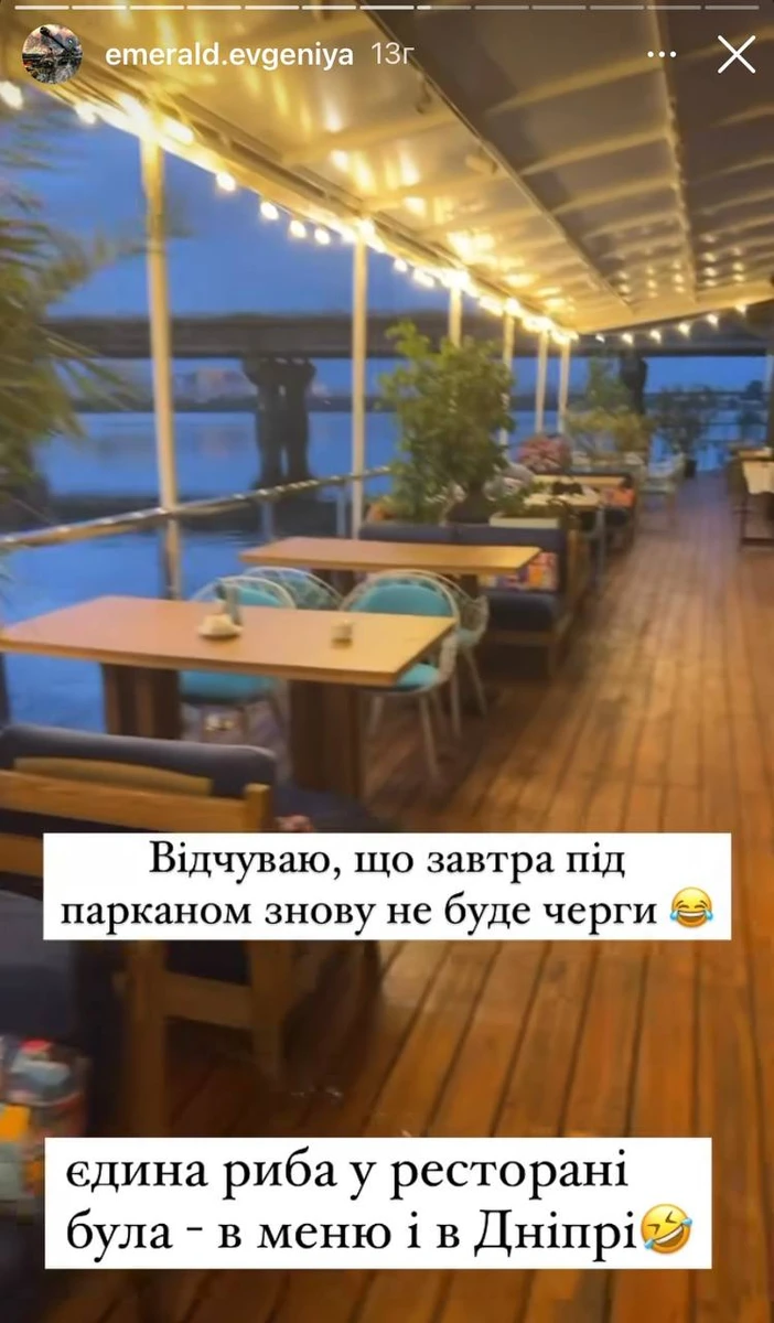 "Знаєте, народ, як сумно жить. Шльондро-мати №1 сьогодні зазнала фіаско. Піду я сьогодні в один ресторанчик, мені там підказали, що там треба отак сідати за столик і охотитися. Буду значить я там сидіти, може мені пощастить", – продовжувала тролити фоловерів Євгенія.